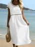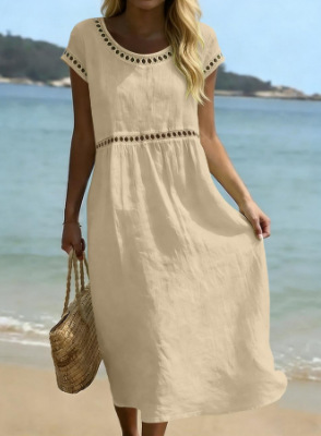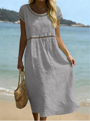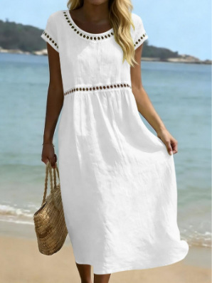 Elegant Round Neck Cotton Dress With Embroidered Lace Trim